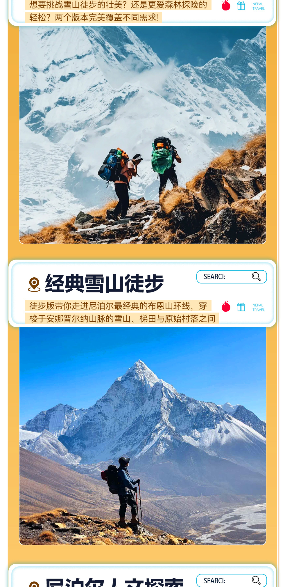 身体被放逐,心灵在回归。只要决定出发,就没有任何困难。高山仰止,每当日出日落,巍峨的雪山会绽放出高傲而神圣的光芒,值得你用心感受,因为会更好的发现自我,认识自我,释放自我。喜马拉雅山脉的美会震撼你的瞳孔,尼泊尔人民的纯朴会震撼你的心灵。左手是天堂,右手是尼泊尔……