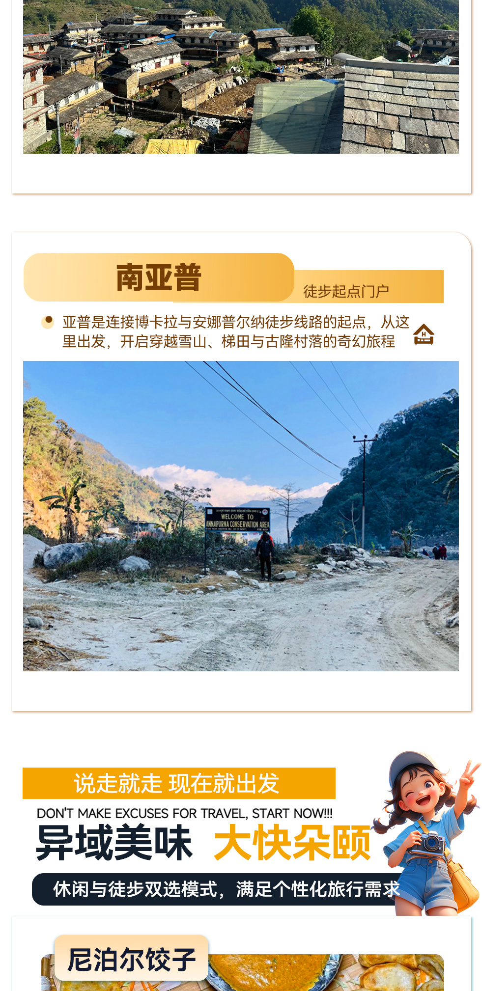 今天,我们徒步团队将迎来最有挑战,也将是你最难忘的一天。我们将在这一天里漫步山中,远观安纳普尔纳雪山美景、雪山下村民的生活、绵延的梯田……当然,还有无比热情的达姆普斯村民。