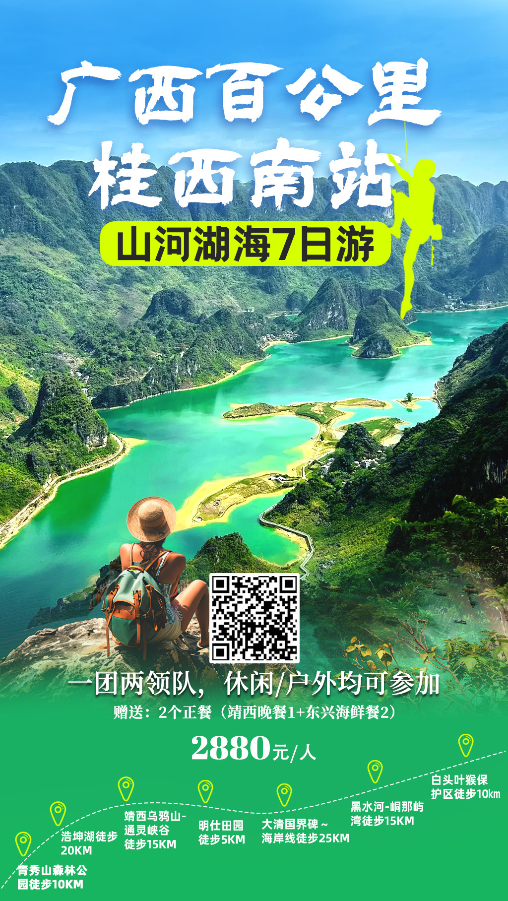 本次行程精心设计,融合了桂西南两大地理奇观:喀斯特地貌与北部湾海岸线。从青秀山的城市绿肺到浩坤湖的高山平湖,从通灵大峡谷的地心秘境到黑水河的田园风光,最后在北部湾海岸线结束行程。七日环线毫无回头路,每日车程合理,动静结合,徒步、休闲科学搭配。